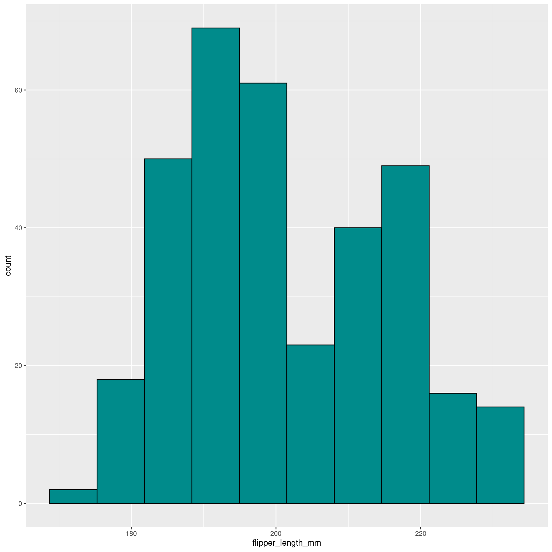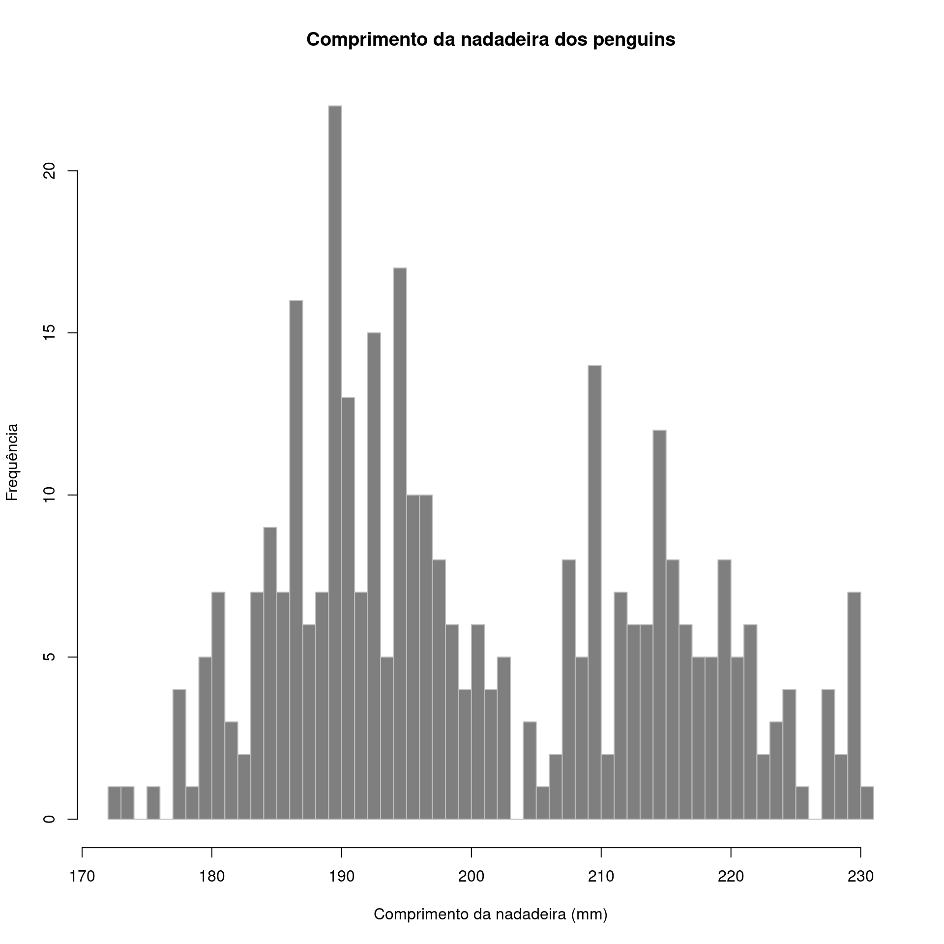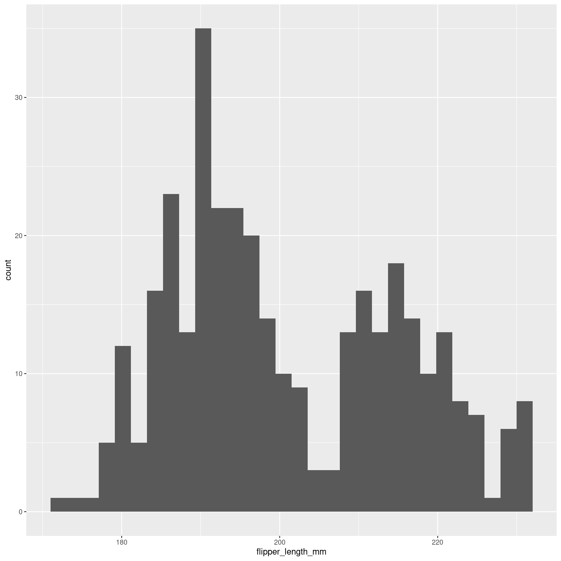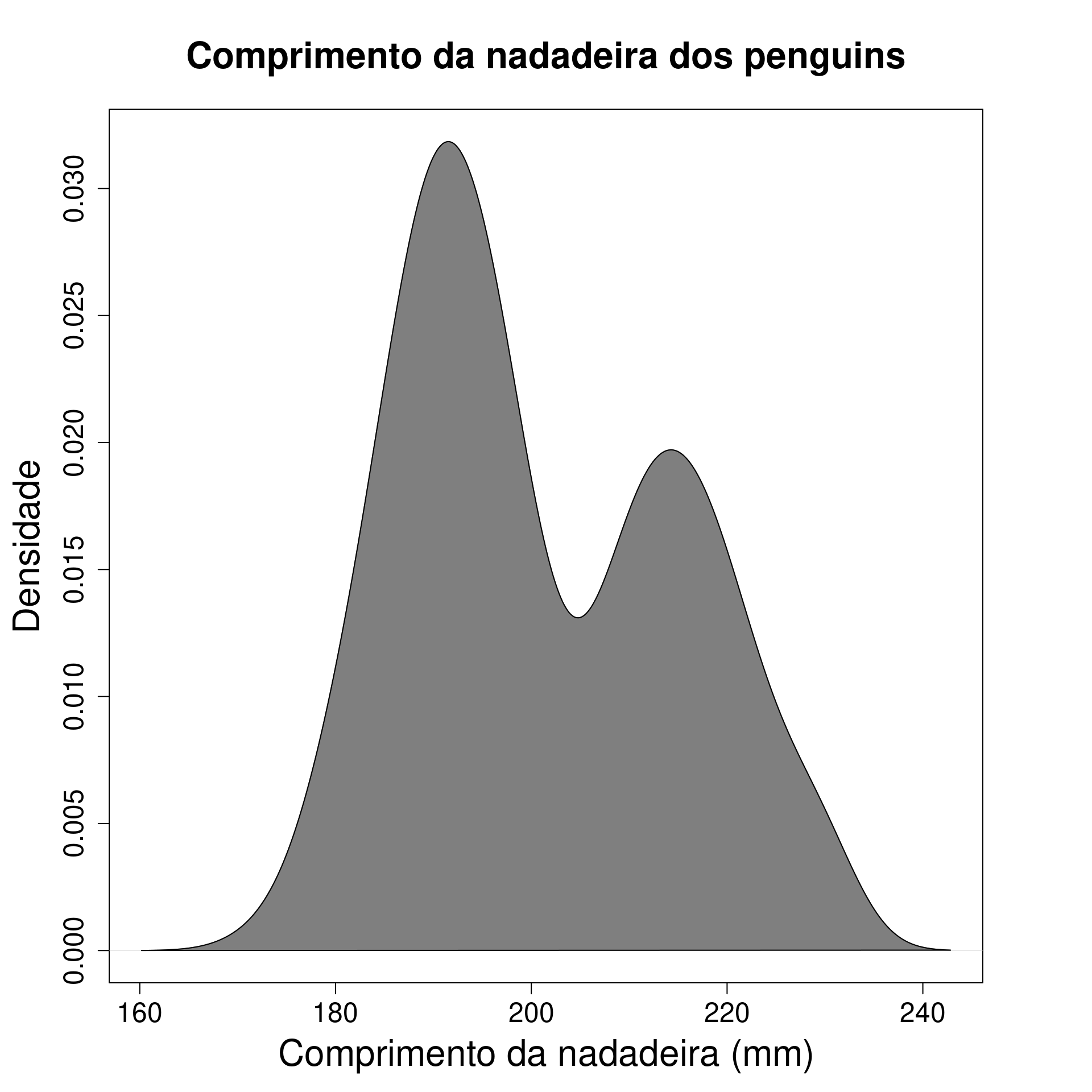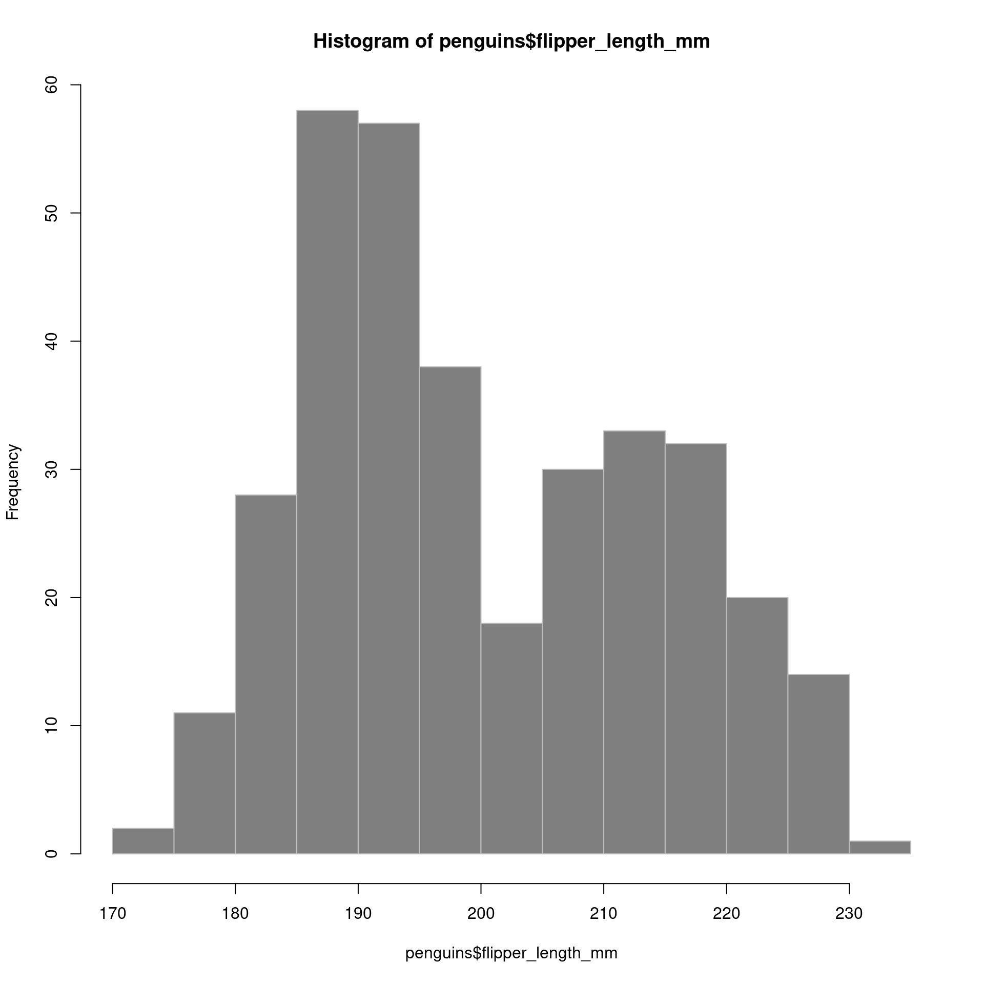 polygon(density(na.omit(penguins$flipper_length_mm)), col = "gray50")